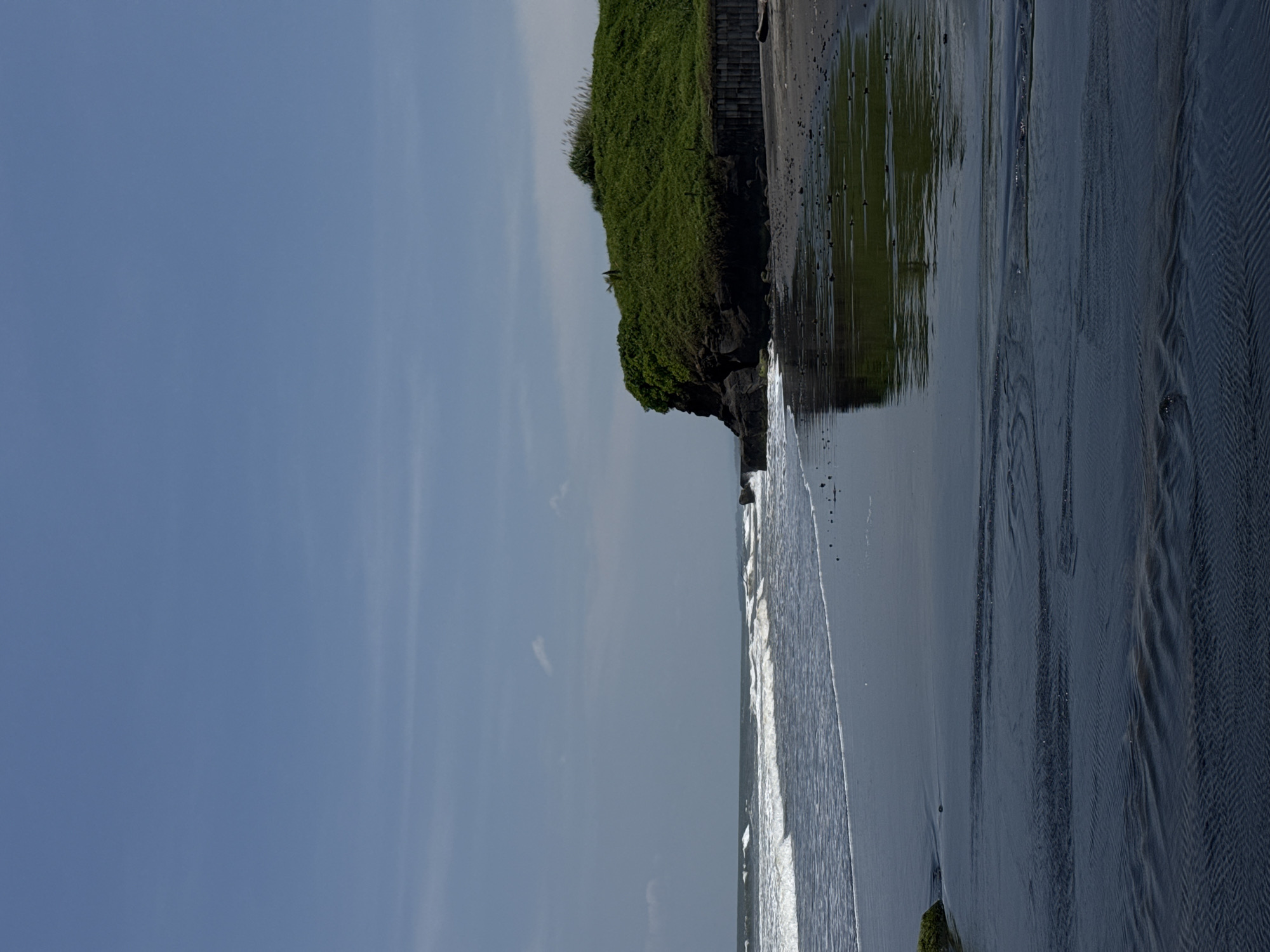 The image displays a coastal landscape in Sudimara, Indonesia, under a clear, light blue sky with minimal, wispy cloud cover. The left and central midground feature a dark grey-blue ocean with white-capped waves breaking towards a dark, possibly volcanic, sandy beach. A prominent, verdant bluff rises on the right side, characterized by dark rock formations at its base and densely covered with green vegetation, including grass and bushes, extending to its crest. Along the base of this bluff, a dark retaining wall, constructed from vertical elements, is visible near the waterline. The foreground shows wet, reflective dark sand with distinct ripples and scattered small, dark pebbles or debris. A piece of light-colored driftwood is situated near the retaining wall. No individuals or animals are present in the scene.