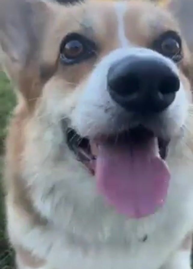 A close-up video shows a Corgi dog outdoors. The dog is panting with its tongue out and its tail wagging. The Corgi has a white and brown coat with black eyes and a black nose. The background shows green grass and some trees.