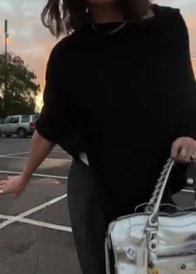A young woman stands in a parking lot at sunset. She wears sunglasses, a black sweater, dark pants, and a silver chain necklace. She holds a silver handbag with charms. She lifts the edge of her sweater to reveal her midriff and then poses with her hand in her hair. Cars are parked in the background, and the sky is a mix of orange and grey.