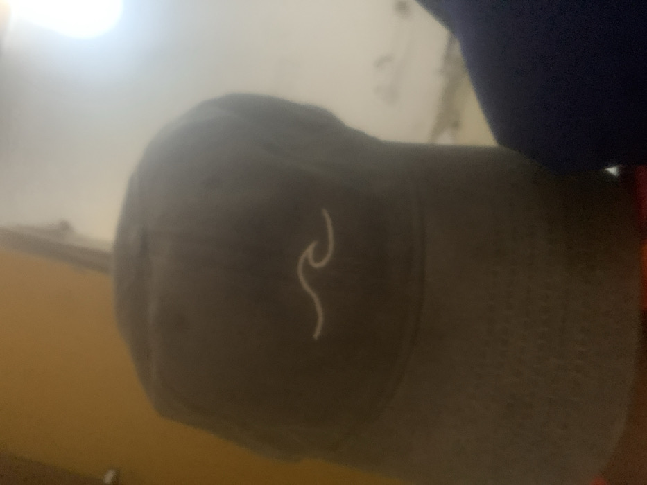 The scene depicts a dark-colored baseball cap, likely charcoal or dark grey, prominently positioned in the foreground. The cap features a white, minimalist wave-like design embroidered on its front crown. The fabric texture suggests a soft material. A dark blue garment or object is partially visible in the lower right portion of the frame, possibly an item of clothing. The background is softly out of focus; the left side presents a muted, yellowish-brown wall or surface, while the right side is dominated by a bright, overexposed light source, indicating an indoor setting with artificial illumination. No individuals are visible, and no actions or interactions are discernible. This scene is located in Gusau, Nigeria.