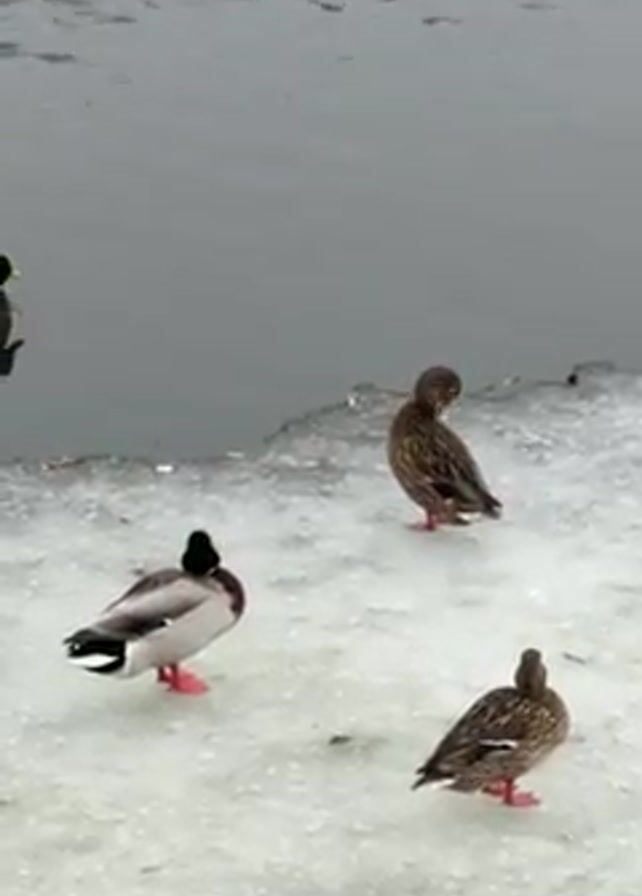 four mallard ducks on a partially frozen body of water. Three ducks are standing on the ice at the water's edge, while one is swimming in the water. All ducks have red feet and are facing away from the camera. The duck in the water is reflecting on the still surface. The sky is overcast and grey, providing an ambient light.