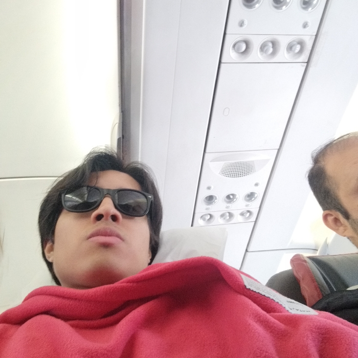 - "A passenger with dark hair and sunglasses is seated on an airplane, covered with a red blanket" by FM-ZqBmD2, licensed under CC BY 4.0