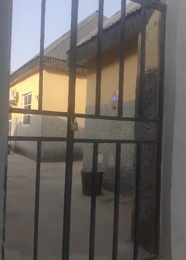 The video begins with a view through a black metal gate secured with a padlock. The view behind the gate reveals a tan building with a gray base, under a gray roof. A small bucket sits in the yard. The camera then pans to the right, showing a long, gray wall with a gray roof. The camera continues to pan right along the wall, revealing an air conditioning unit and a gray building with a window, a bush, and a fire extinguisher. The scene appears to be an outdoor area, possibly a courtyard or alley, with buildings surrounding it. The sky is a pale blue. There are no people visible in the video.