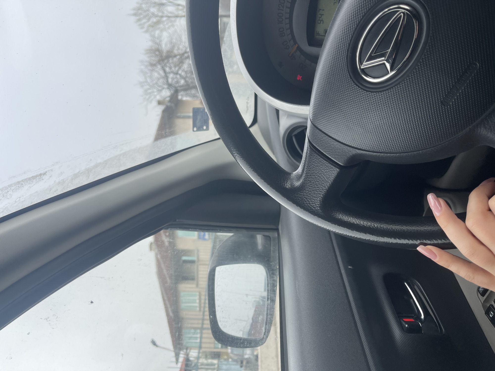 interior of a car, likely a small model, with a black steering wheel and a speedometer visible