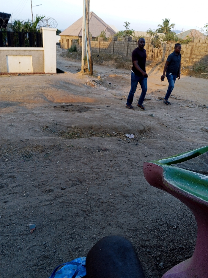 The image depicts an outdoor scene in Adonkolo, Nigeria, at what appears to be late afternoon or early evening. Two adult males are walking leftward across an unpaved, dusty road that dominates the mid-ground. The male in the lead wears a dark t-shirt, blue jeans, and brown shoes, looking directly towards the camera. The second male, positioned slightly behind and to the right, wears a dark collared shirt, blue jeans, and dark shoes, holding a mobile phone in his left hand while looking forward. In the immediate foreground, to the bottom-left, the knee/thigh of an individual wearing dark clothing and blue flip-flops is visible, indicating the perspective of the photographer. To the bottom-right, a portion of a pink/red and green object, possibly a bench or piece of playground equipment, is present. The background features several structures. To the far left, a modern building with a white wall, black metal fencing, and coiled barbed wire along the top is visible. Beyond the road, a dirt path leads towards several single-story buildings with light-colored pitched roofs, some appearing to be metal and others possibly tiled or thatched. These buildings are partially obscured by low concrete block walls. A utility pole stands upright on the left side of the dirt path. The ground is consistently unpaved, displaying loose soil, tire tracks, sparse dry vegetation, and scattered small debris. The sky above is a pale blue, suggesting clear conditions with possible haze. Lighting indicates a low sun angle from the right, casting distinct shadows.