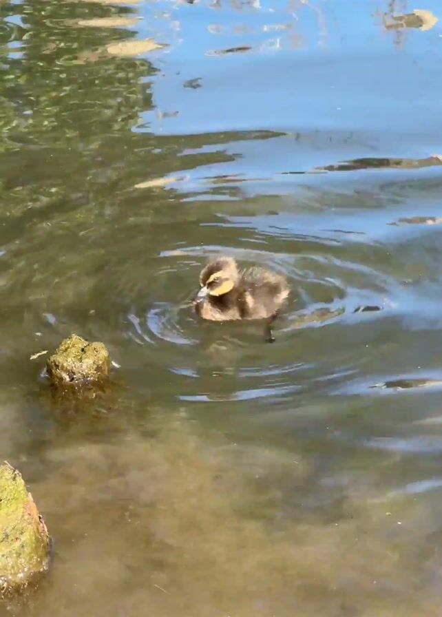 small duckling swimming in shallow water near the edge of a pond or lake. The duckling is brown and black with a yellow bill. It swims around small, moss-covered rocks. The water reflects the sky and trees. Bird sounds can be heard.