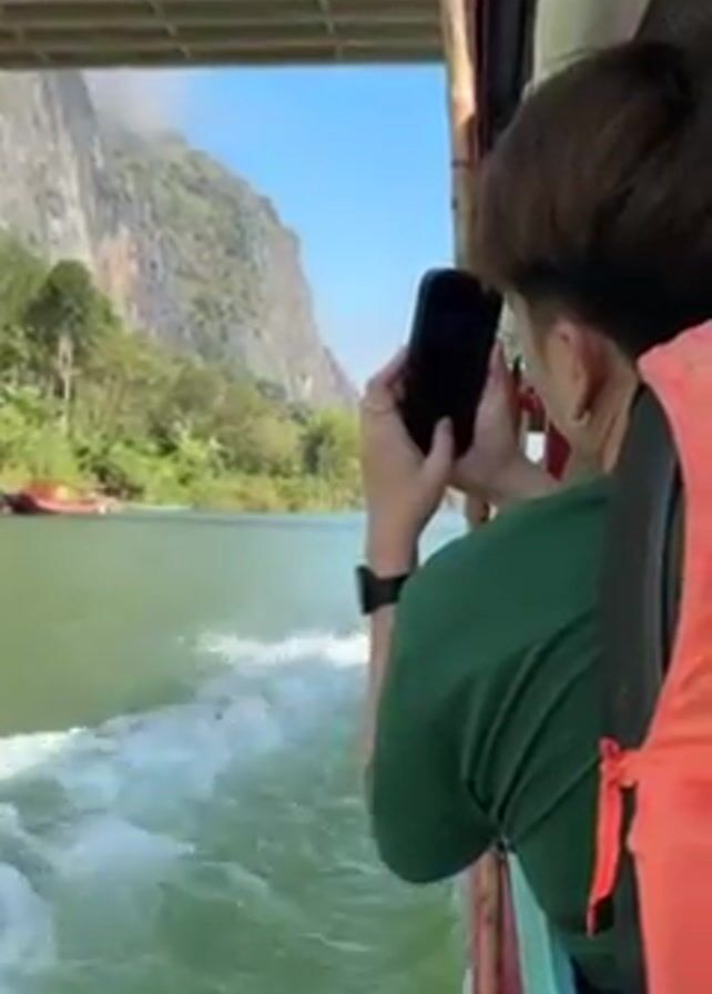 A person is filming a boat ride on a river