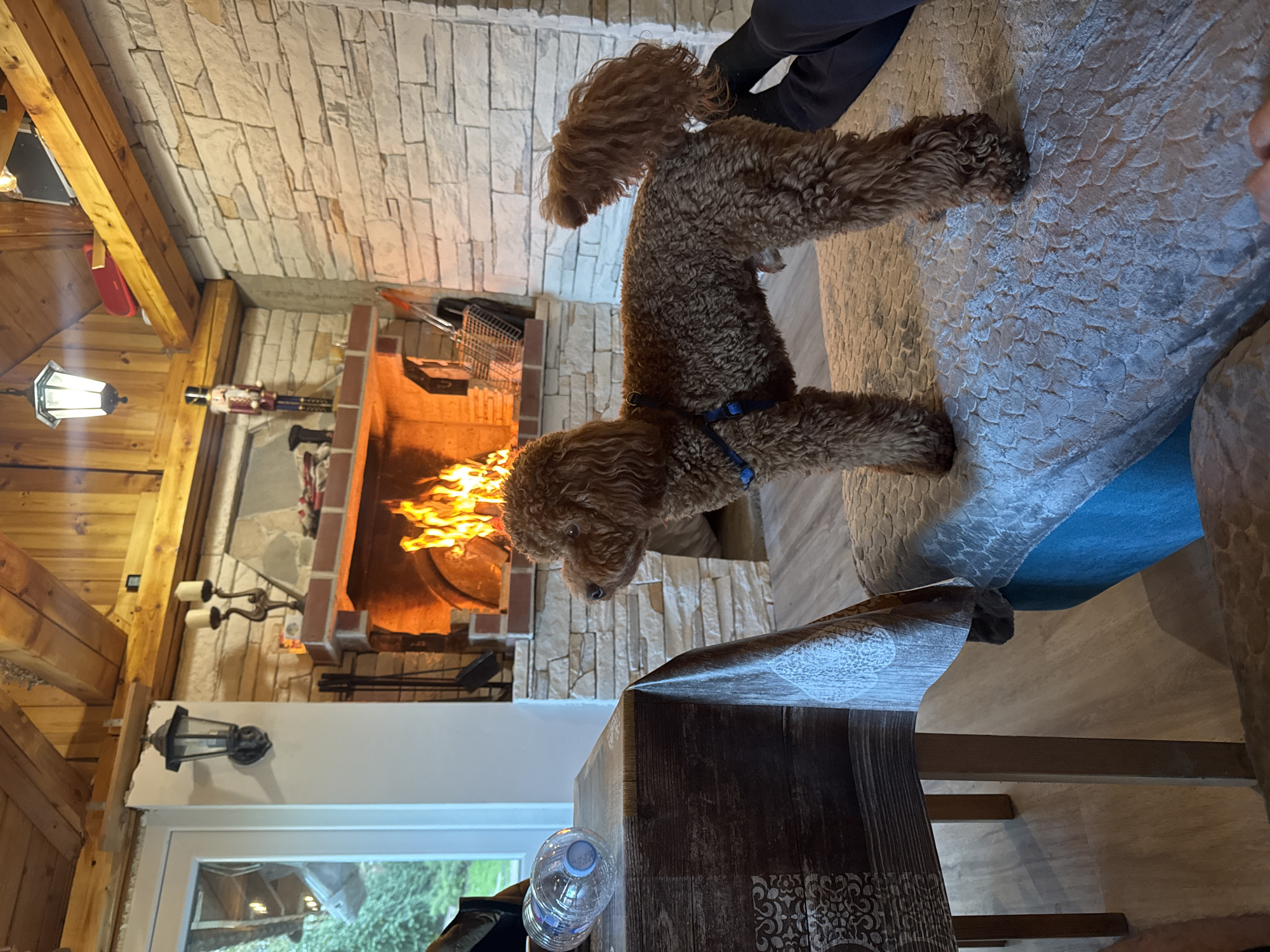 A brown poodle wearing a blue harness stands on a patterned couch. Behind the dog, a stone fireplace blazes with fire. The room features exposed wooden beams and stone walls. A table with a water bottle is in the foreground. The location is not discernible as Kozloduy, Bulgaria based on the image alone.