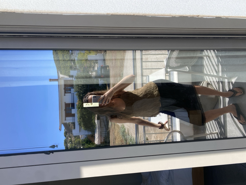 - "A female subject is captured in a full-body mirror selfie, reflected in a glass sliding door or window, standing on an outdoor balcony in Skala, Greece" by FM-1GLuK2, licensed under CC BY 4.0