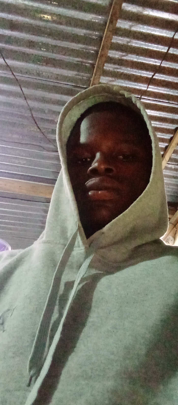 A dark-skinned man wearing a gray hoodie is the focal point. The hood is up, framing his face. He looks directly at the camera with a neutral expression. The background shows a corrugated metal ceiling, possibly indoors, with wooden supports visible. Lighting is subdued, creating shadows across the scene.