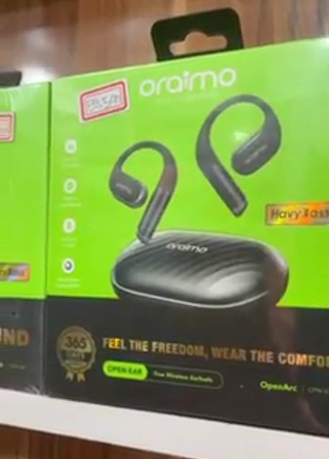 row of "Oraimo" brand wireless earbuds displayed on a shelf
