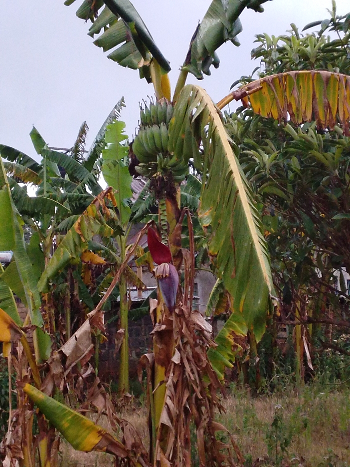 A close-up shows banana plants with a prominent bunch of green bananas hanging from one. A purple banana flower hangs below the fruit. The plants have long, broad leaves, some green and healthy, others turning yellow and brown. Dry, dead leaves cling to the trunks. Other banana plants and greenery fill the background, with a glimpse of a building and overcast sky behind.