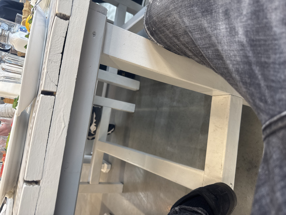 The image presents an indoor dining scene captured from a low, seated perspective. In the immediate foreground, the lower half of an individual's legs is visible, clad in dark gray denim jeans with a distressed appearance and a black, closed-toe shoe on the left foot. The central focus is a white-painted wooden dining table, constructed from planks showing slight wear, supported by a framework of white-painted wooden legs and horizontal braces. On the table's surface, two white oval dishes are positioned, each containing food items consistent with salads or appetizers, showing red and green components. Accompanying these are multiple clear drinking glasses, a salt shaker featuring a blue motif, and a glass carafe. Beneath the table, a light gray, reflective floor surface is visible. White-painted table legs and chair legs are present, alongside the lower extremities and feet of other individuals, including a pair of feet wearing white sneakers with black details. The scene indicates a restaurant or similar dining establishment. The specific location within the city of Plovdiv, Bulgaria, cannot be determined from the visual evidence.