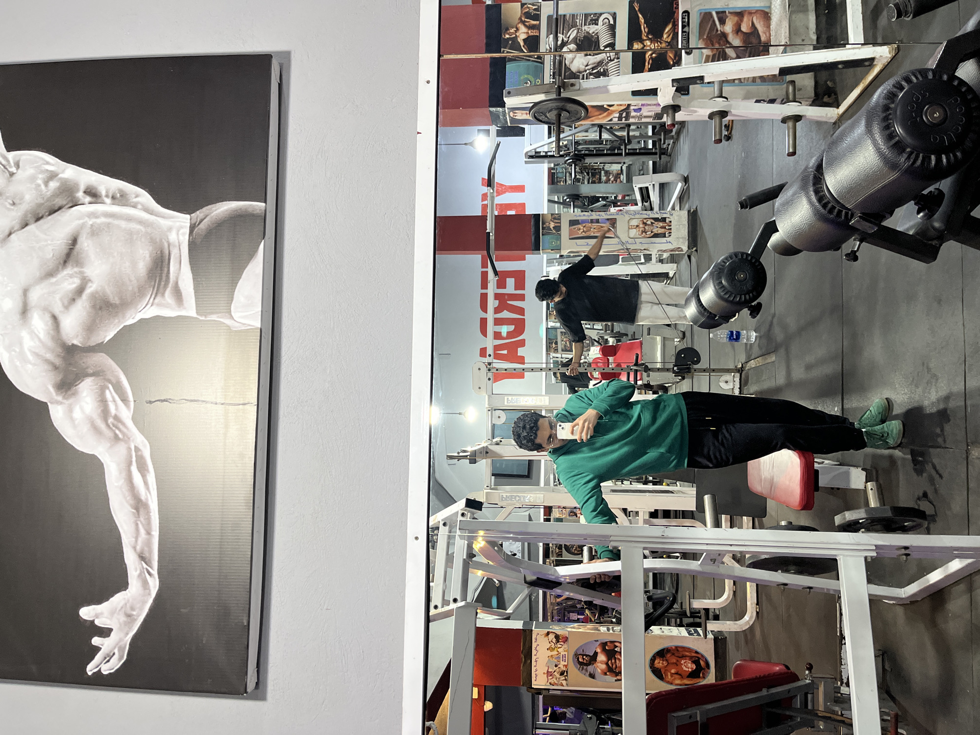 A person wearing a green hoodie, black pants, and green shoes is taking a selfie in a mirror inside a gym. The gym has various weightlifting machines. In the reflection, another person in a black shirt and white pants can be seen. On the wall to the left of the mirror, a framed black and white image of a muscular arm is hung. The location is likely a gym in Fez, Morocco, based on the lettering reflected in the mirror.