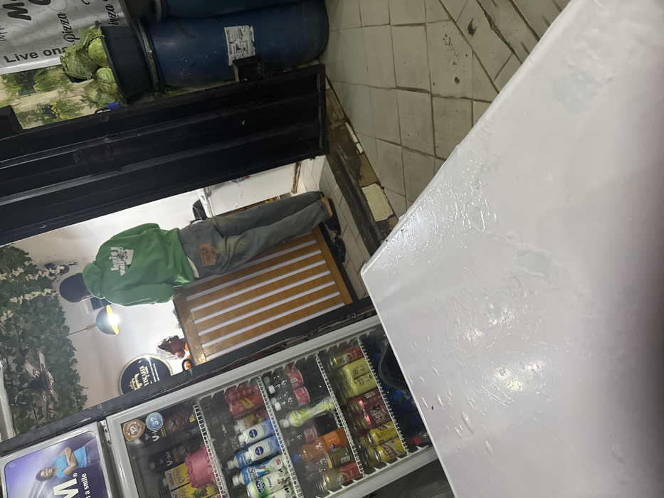 An image of a store interior features a cooler filled with beverages, including cans and bottles. A person in a green hoodie and jeans is visible, standing behind a wooden countertop. Above the countertop are two large blue barrels. The walls are decorated with foliage. Text is visible on the cooler, including "a smile," "Live ong," "Pizza irza," "Levis," and "Beto." A white, reflective object occupies the right side of the frame.