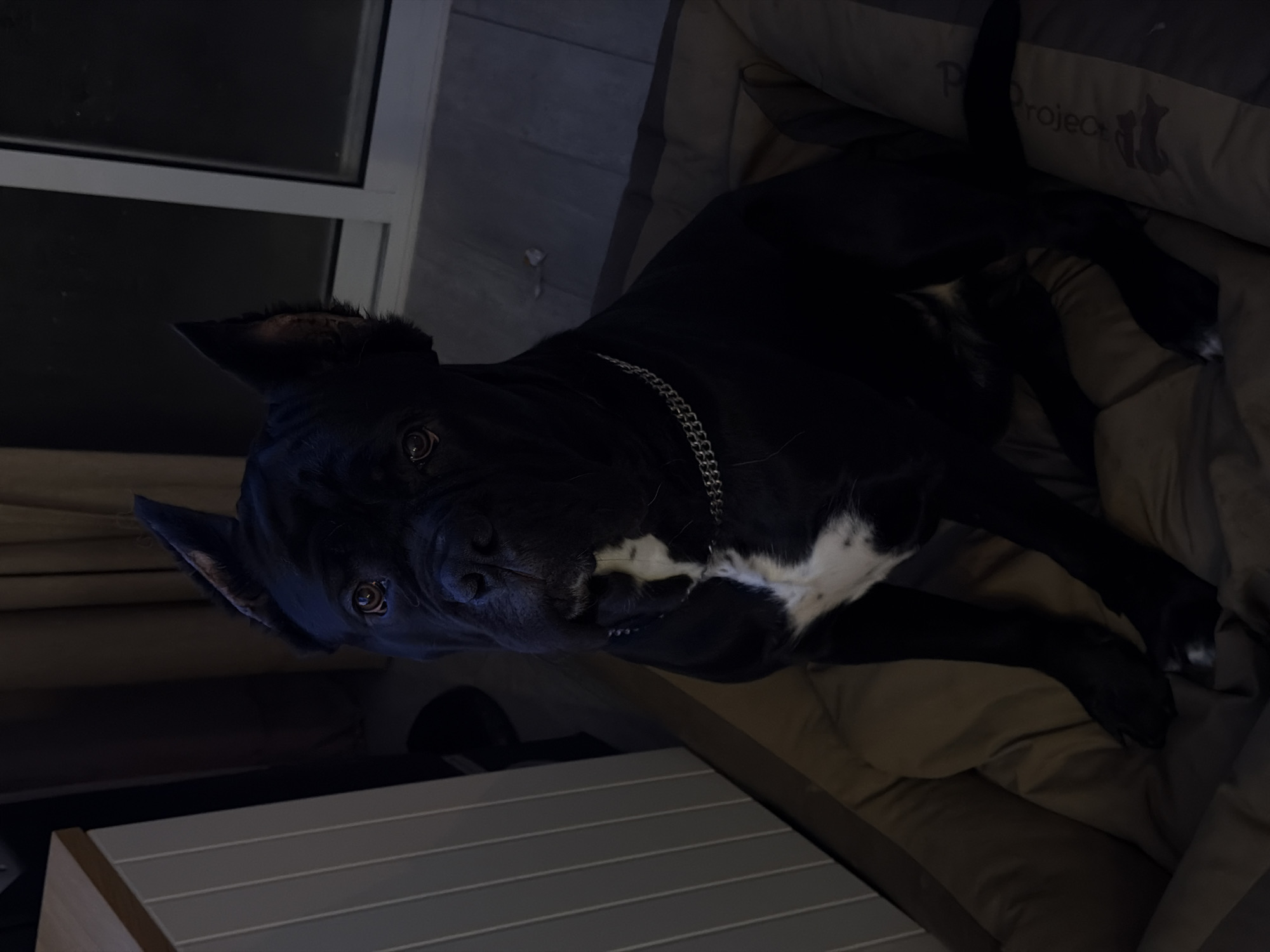 - "In a dimly lit interior in Gan Yavne, Israel, a black Cane Corso dog is depicted sitting on a beige padded dog bed" by FM-OgSS13, licensed under CC BY 4.0