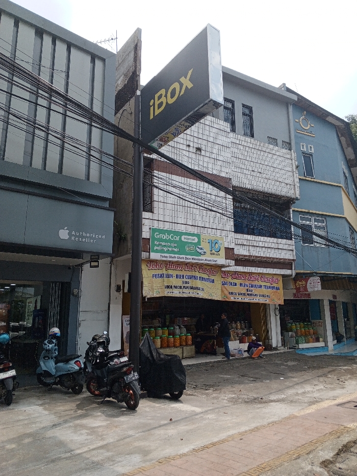 The scene depicts an urban street lined with multi-story commercial buildings under an overcast sky. Numerous black utility wires crisscross the mid-ground. The foreground features a concrete pavement with rough, exposed patches and areas of dirt. From left to right, the buildings are: 1. A modern grey building with vertical ribbed paneling on its upper floors. Its ground level houses a glass-fronted store with an "Apple Authorized Reseller" sign above its entrance. A light blue scooter (Vespa-style) and a black motorcycle are parked on the pavement in front of this store. 2. A multi-story structure with a brown facade transitioning to a white, grid-patterned upper section. A large, black, horizontally mounted sign displaying "iBox" in yellow lettering extends from this building on a dark pole. Below this, a green "GrabCar Hemat" sign is visible, along with a prominent yellow banner reading "Toko Oleh Oleh Dan Minuman Alam Sari" (Gift Shop and Alam Sari Drinks) and "Pusat Oleh-Oleh Cianjur Termurah" (Cheapest Cianjur Souvenir Center). The ground-floor shop entrance displays numerous packaged food items in clear containers. Two individuals are present near this shop entrance: one person in dark clothing stands upright, and another person wearing an orange garment is crouched on the ground. A third person is faintly visible inside the shop. A motorcycle covered by a black tarp is parked on the pavement to the right of the parked scooters. 3. A light blue building with a distinctive circular architectural detail on its upper facade. A small "Alpine" sign is visible on its ground floor, which also appears to be a storefront with colorful items displayed. The visible signage in Bahasa Indonesia, including the specific reference to "Cianjur," indicates the scene is located in Indonesia. No elements within the image identify the location as Multhan, India.