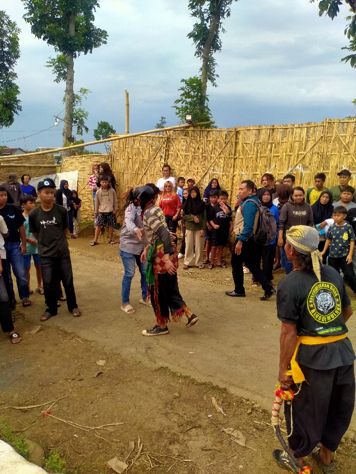 The image captures an outdoor scene featuring approximately thirty to forty individuals gathered on an uneven dirt path. In the background, a tall, light-colored bamboo fence encloses an area, behind which several tall, slender trees with green foliage rise into an overcast sky. In the foreground right, an adult male, seen from behind, wears a dark short-sleeved shirt with a white tiger emblem and text, black baggy pants, and a yellow sash tied at the waist. He has a yellow bandana on his head and holds a braided rope-like object with red and yellow tassels. In the mid-ground center, two individuals are interacting. One individual wears a light-colored long-sleeved top and blue jeans, facing a second individual dressed in dark traditional attire, characterized by a patterned sash (red, green, white squares) draped over the shoulder and waist, and tassels on the lower legs. This second individual is actively moving, with one foot partially lifted. Multiple onlookers, consisting primarily of young adults and teenagers in casual clothing (t-shirts, hoodies, jeans, headscarves), are positioned to the left and right, observing the central interaction. A man with a backpack is visible among the observers in the mid-ground right. The ground is largely bare earth with some sparse dry vegetation. The location is Unknown, Unknown.