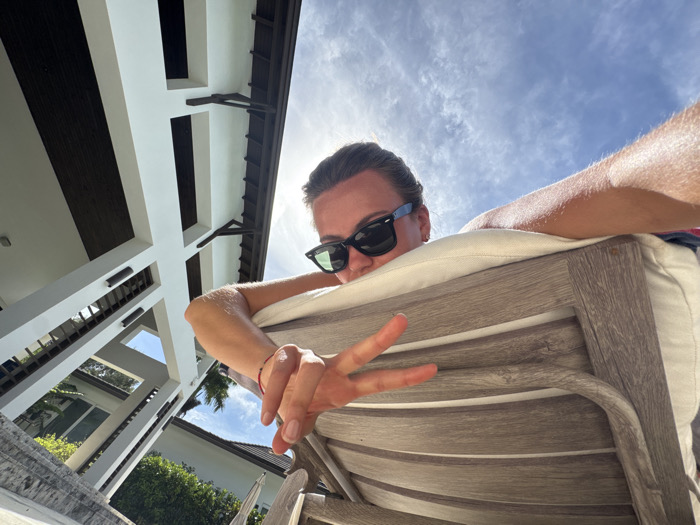 A low-angle, sunlit photograph depicts a female individual positioned behind a light-colored wooden outdoor lounge chair with a cream cushion