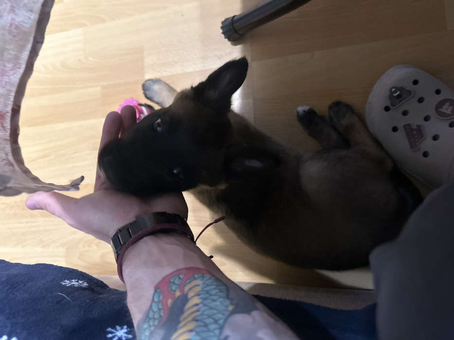 The image depicts an indoor scene in Hrabarsko, Bulgaria. A dark-furred puppy, appearing to be a young canine, is positioned on a light wooden floor, looking upwards. A person's hand is gently resting on the puppy's head. The visible portion of the person's arm is heavily tattooed with a colorful, scale-like design, and a dark wristband with a red cord is worn on the wrist. The puppy has dark brown to black fur with lighter markings visible on its paws and face. To the left, a blue fabric adorned with white snowflake patterns is present. On the lower right, a light-colored Croc shoe, decorated with multiple charms, is partially visible. In the background, a small pink object, consistent with a toy, and a dark, ridged cylindrical object are faintly discernible on the floor.