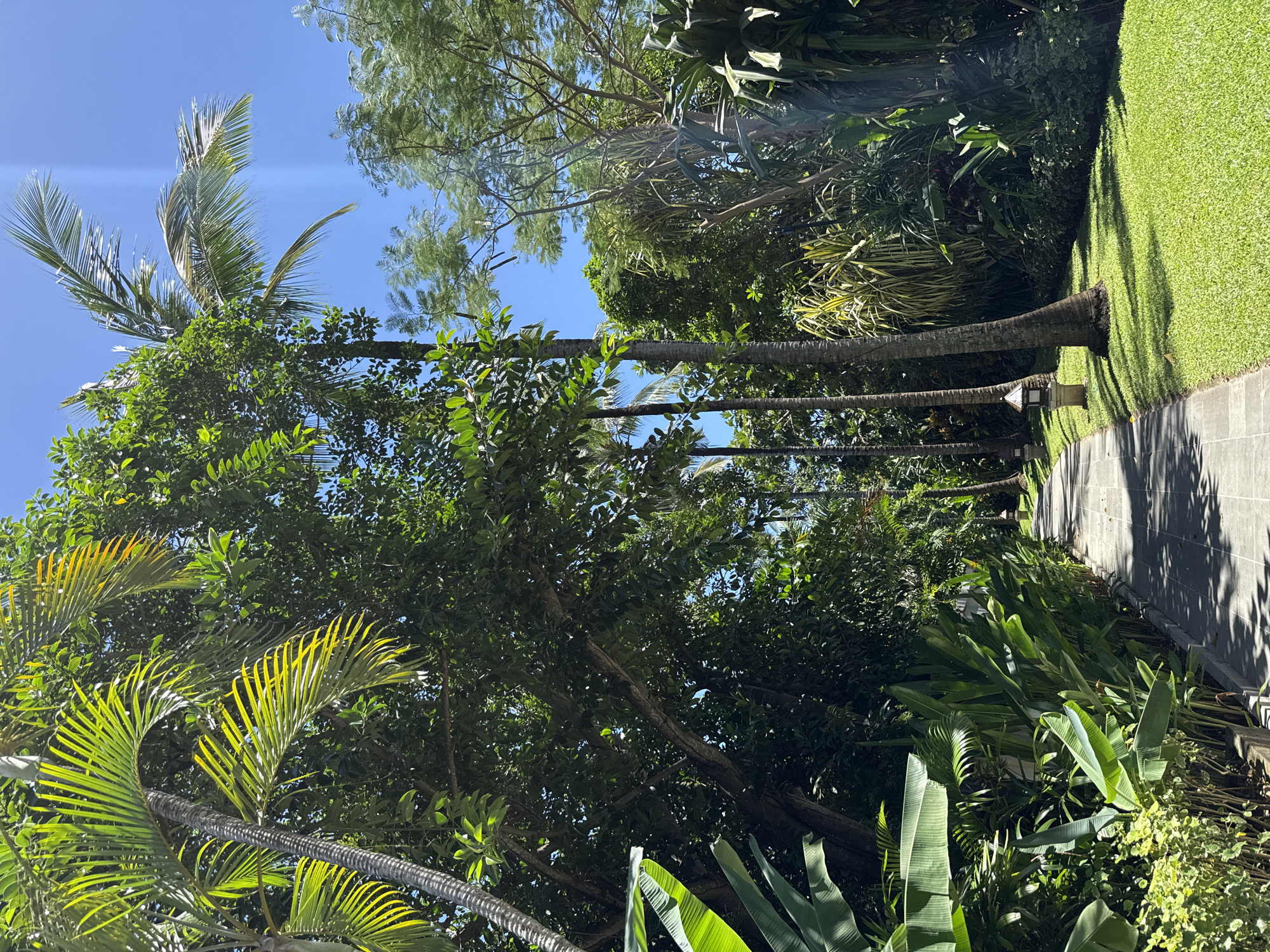 The image depicts a tropical scene likely in Nusa Dua, Indonesia, characterized by lush vegetation and clear skies. Tall palm trees with textured trunks are prominent, some framed against the bright blue sky. The leaves are various shades of green. The ground level features dense foliage, including banana leaves and other tropical plants. A pathway or walkway with gray stones runs alongside the vegetation. Lawn is also visible. The lighting suggests a sunny day, with shadows cast by the trees and plants. No people are visible in the shot.