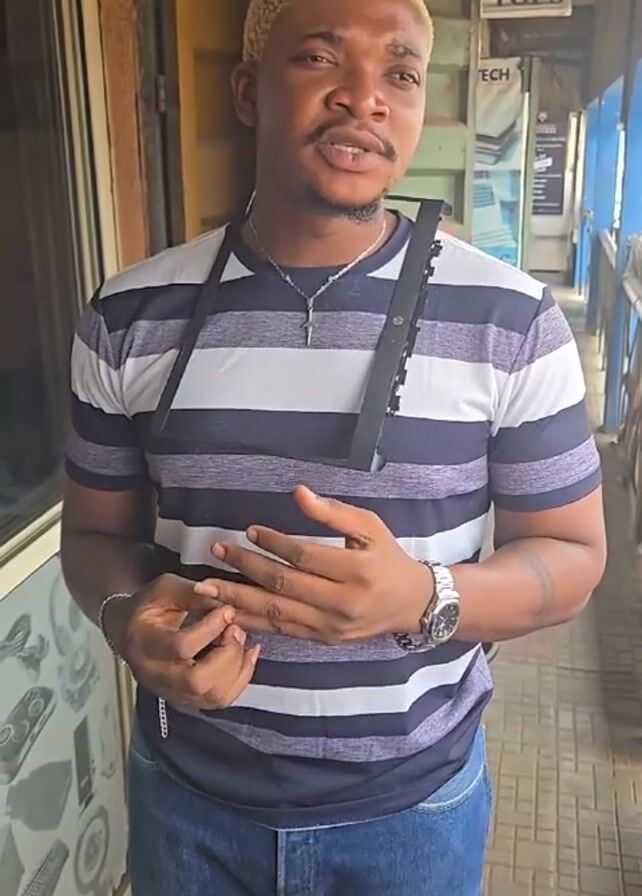 man with blond hair, wearing a striped shirt and blue jeans, standing outside a store. He has a black object hanging around his neck. He is speaking to the camera and gesturing with his hands. The store behind him appears to offer computer repair services. There are glass windows and metal railings visible.