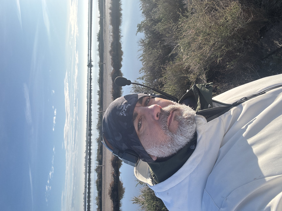 The image displays a male individual in a selfie-style close-up, positioned outdoors against an expansive, flat landscape. The man has a grey beard and dark hair, visible beneath a dark camouflage-patterned beanie bearing a white Arc'teryx logo. He wears dark over-ear headphones with an attached boom microphone extending towards his mouth. His attire consists of a light beige hooded jacket worn over a dark olive-green layer. He is looking directly into the camera with a neutral expression. The background reveals a series of extensive, rectangular, shallow water basins or ponds separated by narrow earthen banks, which are sparsely covered with low-lying, scrubby vegetation. This environment is consistent with a large-scale salt production facility or an aquaculture farm, located in an open, rural, or industrial area within the city of Unknown, Unknown. The sky is clear blue with scattered high-altitude wispy clouds, indicating bright daylight conditions. A faint haze is visible along the distant horizon. No other individuals or explicit interactions are depicted.