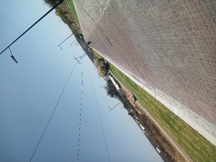 The image displays an outdoor scene in La Venta, Mexico, under a clear, light blue sky, captured with a leftward tilt. A wide, light reddish-brown paved road, composed of interlocking paver blocks, occupies the right side of the frame, receding into the distance. A concrete curb delineates the road from a parallel strip of manicured green grass on its left. Beyond this grassy strip, a dry, yellowish-brown terrain with sparse vegetation extends, featuring distant structures and utility infrastructure. Multiple thin, dark utility lines span horizontally across the upper left sky. A prominent black streetlight pole with a horizontal luminaire is positioned in the far right foreground. Additional similar streetlights line the left edge of the paved road, receding along the grassy strip. In the mid-ground, a metal lattice-work power pylon is partially visible on the left, amidst natural vegetation. A cluster of light-colored, bushy shrubs is present in the central-left area. An unidentifiable dark object rests on the paved road in the mid-distance. No human subjects are discernible.