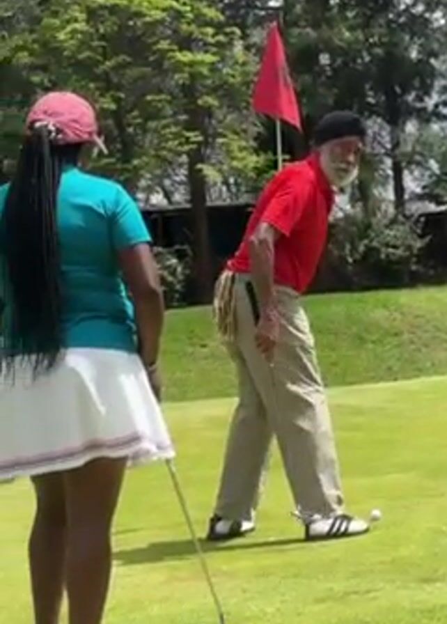 three people on a golf course. A person in a red shirt, light colored pants, and a turban is putting on a green. A person in a teal shirt and white skirt looks on. Another person in a red vest and jeans stands by holding a towel and golf balls. A red flag is visible in the background. The day is sunny.