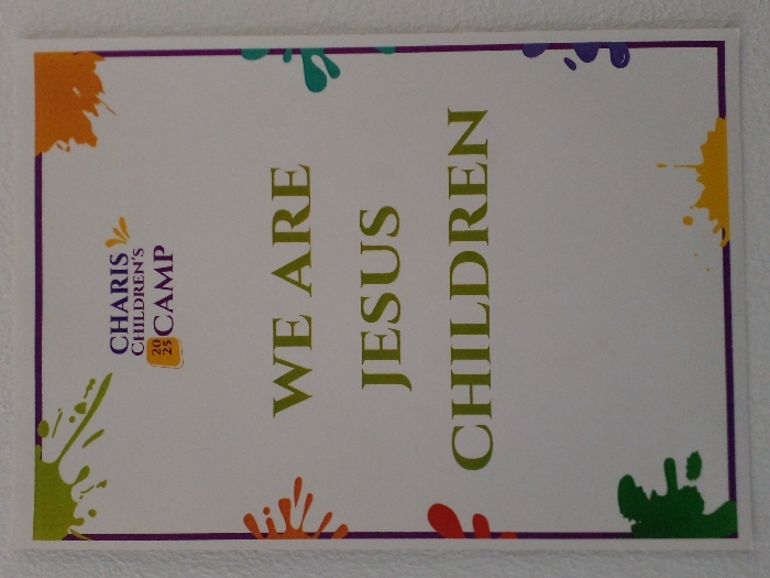 A vertically oriented rectangular sign, approximately 8.5 x 11 inches, is centered against a plain, light-colored wall surface. The sign features a thin purple border encompassing its perimeter. Various multi-colored paint splatters are graphically placed in the corners and along the edges: green in the top-left, orange in the top-right, red/orange on the mid-left, teal on the mid-right, dark green on the bottom-left, yellow on the bottom-right, and a small dark blue splatter near the bottom-right corner. The upper portion of the sign displays the text "CHARIS" in purple with an adjacent yellow/orange stylized mark, followed by "CHILDREN'S" in smaller purple text. Below this, a small square logo containing "20" above "25" in yellow on an orange background precedes "CAMP" in purple, collectively indicating "Charis Children's Camp 2025". The main body of the sign prominently features the phrase "WE ARE JESUS CHILDREN" in capitalized, olive green text, centered on three lines. No individuals, specific objects beyond the sign, or actions are depicted. The scene is located in the city of Narayi, Nigeria.