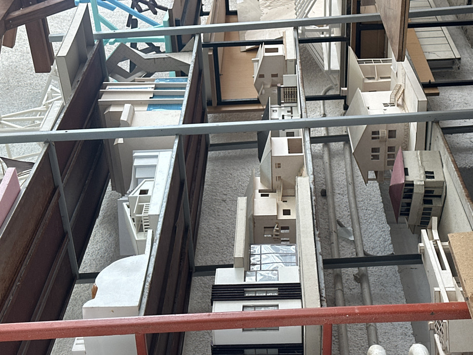 The image displays an interior space densely populated with various architectural models arranged on multi-tiered industrial-style shelving units