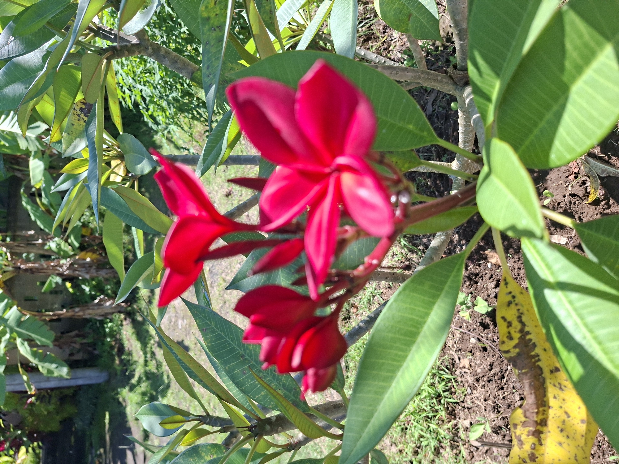 The image depicts a close-up of a red plumeria flower cluster in Lodtunduh, Indonesia. The flowers are in full bloom and positioned in the upper central area of the frame. They are surrounded by large, green leaves that display prominent veins. The background consists of a blurred garden scene with glimpses of grass, vegetation, and possibly a pathway. The ground is visible in some areas, revealing dark soil and fallen leaves. A few discolored, yellowing leaves with black spots are also present. The overall lighting suggests a bright, sunny day, creating highlights on the leaves and flowers.