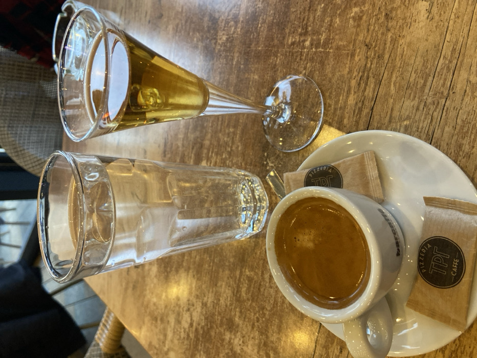 An overhead shot captures a wooden table setting with a relaxed vibe. A tulip glass filled with a golden beverage lies horizontally. A straight-sided, empty water glass sits beside it. A white saucer holds a cup of espresso, flanked by two brown sugar packets branded with “Pizzeria TPL Caffe”. The scene conveys a casual break or a meal in progress, likely at a restaurant or café.