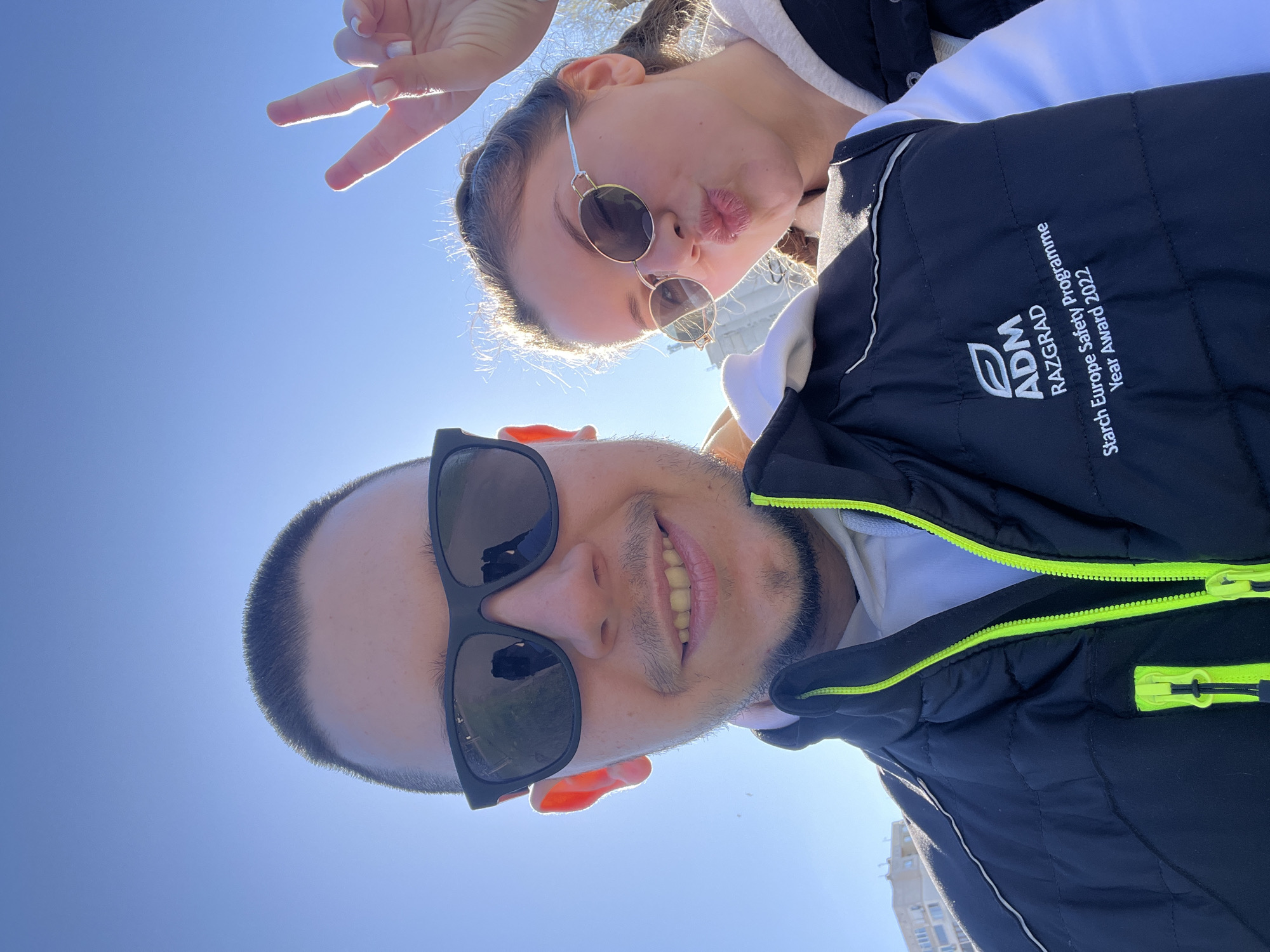 A selfie is taken of a man and a woman in Sofia, Bulgaria. The camera is positioned below eye-level, pointing upwards towards the sky. The man, in the foreground, is smiling and wearing sunglasses. He has short, dark hair and a neatly trimmed beard. He is wearing a black jacket with a neon green zipper. The woman is positioned slightly behind the man and is making a peace sign with her fingers. She is wearing sunglasses and puckering her lips. She has brown hair that is styled in braids. In the background, the sky is a clear, bright blue. The man's jacket has text, which reads, "ADM RAZGRAD Starch Europe Safety programme Year Award 2022". Buildings are visible at the bottom right of the image.