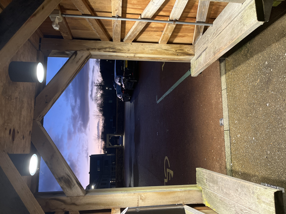 The image depicts an outdoor scene at twilight, viewed from within a weathered wooden-framed structure in Newton St. Loe, United Kingdom. The foreground is defined by robust timber posts and beams forming an A-frame aperture. Two black cylindrical spotlights, actively illuminated, are mounted on the overhead beams. Integrated into the structure on both the left and right are weathered wooden benches. A light gray aggregate surface constitutes the ground directly beneath the viewpoint. Beyond the wooden structure, a dark reddish-brown tarmac parking area is visible. A yellow disabled parking symbol is painted on the asphalt to the left. On the right, a faded green line marks a boundary. Two dark-colored vehicles are parked on the right side of the tarmac; the closer vehicle is a dark SUV with license plate 'FY66 VTF'. In the midground, a low stone wall or hedge delineates the parking area, with a stone archway visible directly ahead. A multi-story building with dark exterior walls is present on the far left, situated behind a stone wall. The distant horizon is characterized by bare trees and dark vegetation silhouetted against a twilight sky, which displays a gradient from deep blue overhead to shades of pink and purple near the horizon, with scattered clouds. No individuals are present.