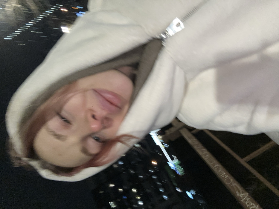 A selfie shows a young woman wearing a white hooded jacket with a grey layer underneath. The hood is up, partially obscuring her face. Her face is turned slightly, revealing her nose, lips, and one eye. She has light skin and pink-tinged hair. The background is a blurry night cityscape, with building lights visible. Part of a railing is in the foreground, suggesting a high vantage point. The image is rotated, with the woman appearing sideways.