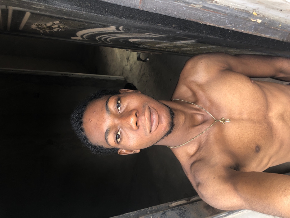 A young adult male, appearing to be of Black ethnicity, is depicted from the mid-torso upward, centered in a doorway within the city of Oraukwu, Nigeria. He has dark, short, textured hair styled with small braids or twists, a light beard on his chin, and full lips. His expression is a slight smile, and he gazes directly at the camera. He is shirtless, displaying his bare chest and shoulders, and wears a gold-colored chain necklace with a gold-colored cross pendant. The background consists of a dimly lit interior space, likely a room or hallway, with a dark, textured door frame or wall visible immediately to the viewer's right. Further back, another dark doorway or opening leads to a deeper, unlit area. The lighting suggests an interior setting with ambient light originating from the direction of the camera.