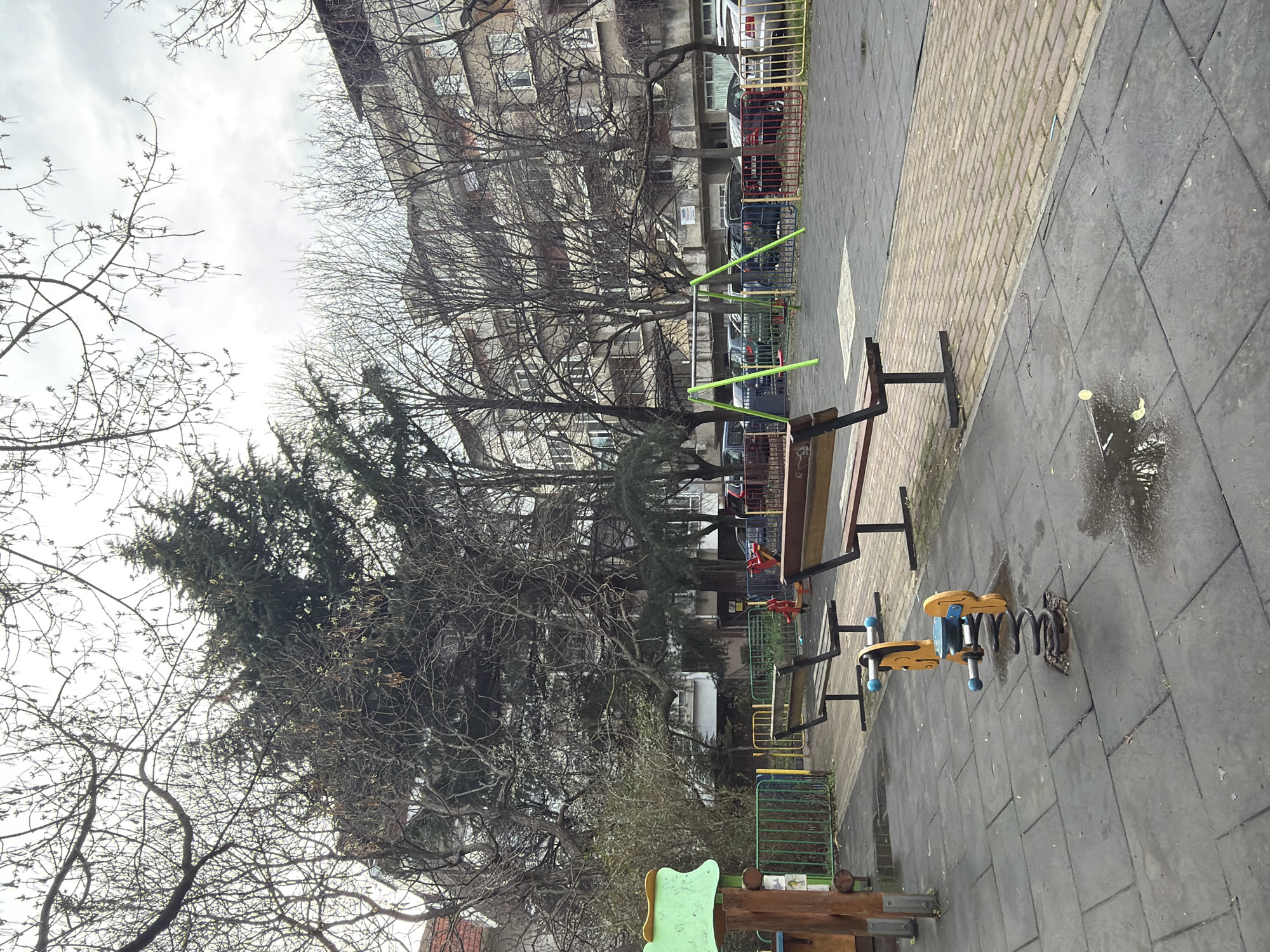 playground in Varna, Bulgaria. The playground features a seesaw with spring-mounted seats, a wooden climbing structure, and possibly other play equipment partially obscured by trees. The ground is paved with a combination of dark gray tiles and brickwork. Bare trees dominate the background, partially obscuring a multi-story apartment building. A metal fence runs along the edge of the playground, separating it from a parking area with vehicles. The sky is overcast. There are no people visible in the frame. A puddle of water is visible on the ground.