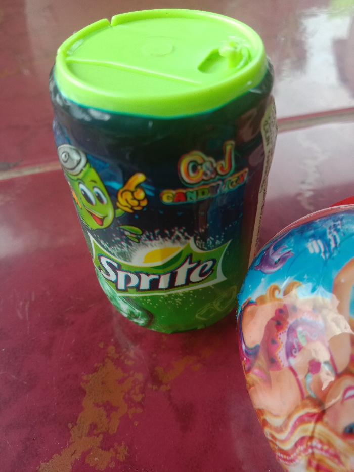 The image displays a green, can-shaped plastic candy container with a lime-green flip-top lid, positioned on a reddish-brown surface. The container's label features the "Sprite" logo, a cartoon character resembling a green, smiling soda can, and the text "C&J CANDY ICE." To the right and partially out of frame, a spherical object with a blue and pink patterned wrapper, possibly depicting a stylized female character, is visible. The reddish-brown surface, potentially a tiled floor, shows areas of light brown staining or residue. No individuals, direct actions, or interactions are present. The scene is located in Ciherang, Indonesia.