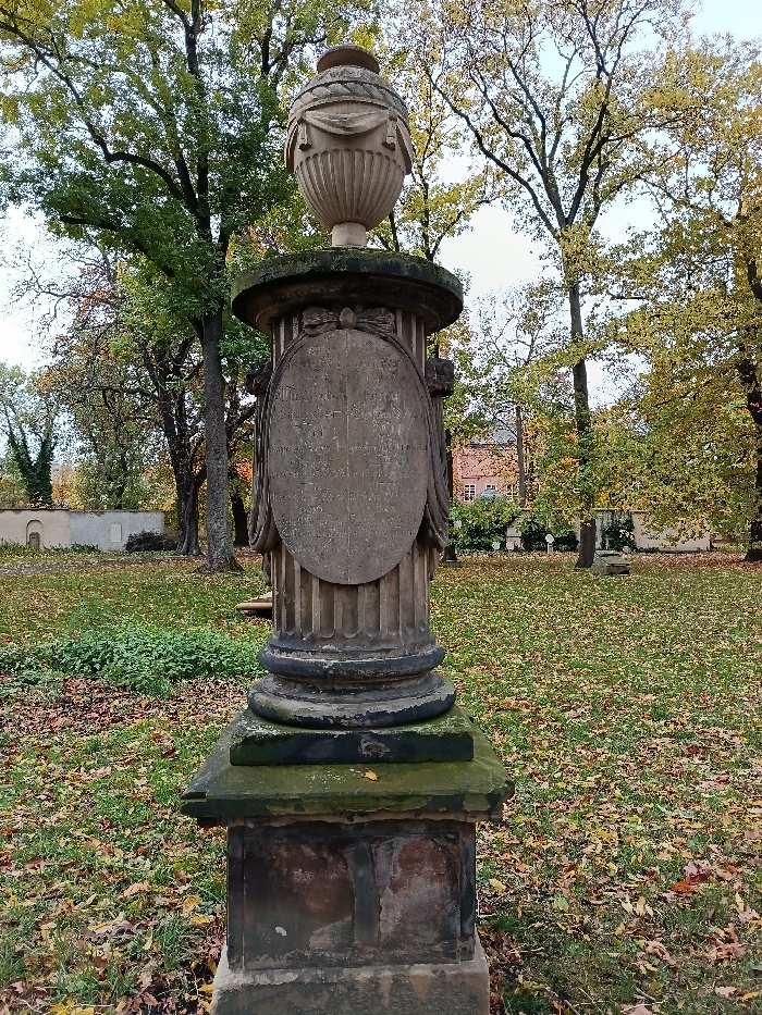 An ornate stone monument stands centrally in a historic cemetery in Leipzig, Germany, likely the Alter Johannisfriedhof. The monument comprises a rectangular, weathered stone base supporting a larger, moss-covered square plinth. Above this, a fluted column with a molded base and capital features an oval, weathered stone plaque on its front, adorned with carved drapery motifs on its upper and side edges. Inscriptions on the plaque are illegible due to distance and wear. The column is surmounted by a large, classical stone urn with vertical fluting on its lower half and a draped fabric motif encircling its upper section, topped with a rounded lid. The ground around the monument is covered in green grass heavily interspersed with fallen autumn leaves in shades of yellow, brown, and orange. Numerous mature deciduous trees, some retaining green foliage while others display autumnal yellow and brown leaves, frame the background against an overcast sky. To the left, a low, light-colored stone wall is visible, indicative of other grave enclosures. To the right, a multi-story building with a reddish-brown facade and visible windows is partially obscured by trees in the mid-distance. There are no individuals or discernible actions present in the scene.