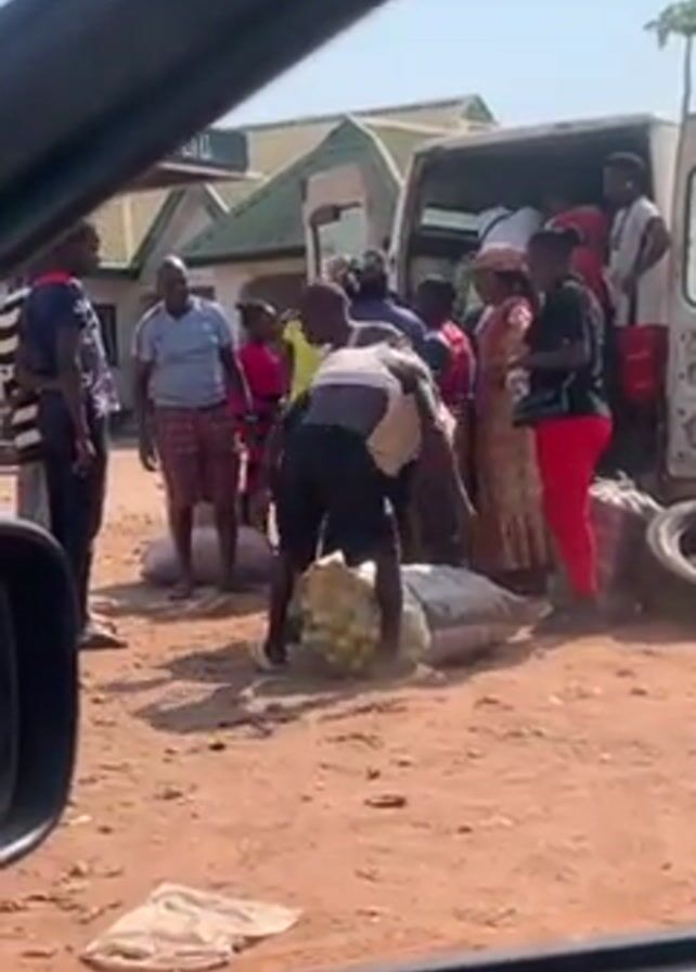 From the perspective of inside a car, the video captures a scene outside where a group of people are interacting with a white van. The people are of mixed ages and are dressed in casual clothing, with some wearing traditional attire. Several individuals are standing around the open rear doors of the van, seemingly unloading or organizing items. One man bends over to pick up a large sack filled with produce, possibly yams or similar root vegetables. Another man is standing in the doorway of the van. The environment appears to be a dusty, unpaved area, and there's a building with "LTD" visible on its signage in the background. Spare tires lie on the ground near the van. The light suggests it is daytime, with a clear sky overhead.