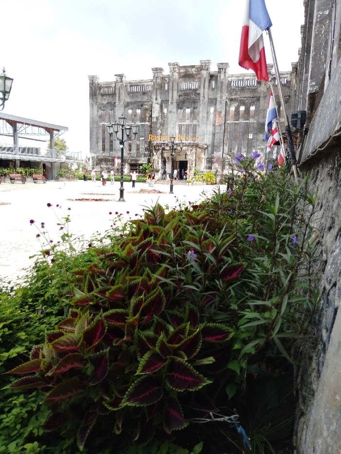The image depicts an outdoor plaza leading to a large, aged building in Ngadirejo, Indonesia. In the immediate foreground, a dense cluster of coleus plants with deep red and green leaves is prominent, bordered on the right by a grey, coarse-textured stone wall. Other foreground vegetation includes green plants with small purple blossoms and lower-growing groundcover with spherical purple flowers. The midground features a spacious, light-colored paved plaza. A black, ornate three-lamp lamppost stands near the center of the plaza, with another similar lamppost partially visible further back. Several individuals, appearing as pedestrians or visitors, are sparsely distributed across the plaza. To the far left, an open-air modern structure with a grey roof and metal framework contains multiple wooden benches. The background is dominated by a multi-story building with a weathered, grey stone or concrete facade. The architecture exhibits classical or colonial influences, including pilasters and multiple window openings, with some areas showing exposed brick. Above its elaborate arched entrance, the text "Rasa Mulia" is visible. Multiple people are gathered near the main entrance. To the right of the building, a series of flagpoles displays flags, with the flag of France prominently featured at the top, followed by a partially visible flag resembling the Netherlands. The sky is bright and overcast.