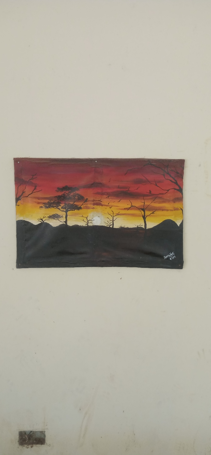 A rectangular artwork, depicting a sunset or sunrise landscape, is mounted on a light beige wall