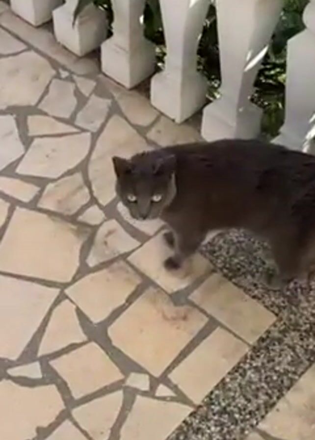 A woman's hand with a silver ring on the index finger moves towards a grey cat on a tiled patio. The cat has bright green eyes and is wearing a light blue collar. The woman touches the cat's nose with her finger. The patio is made of irregular tiles, and a white balustrade can be seen in the background. There is some greenery visible behind the balustrade.