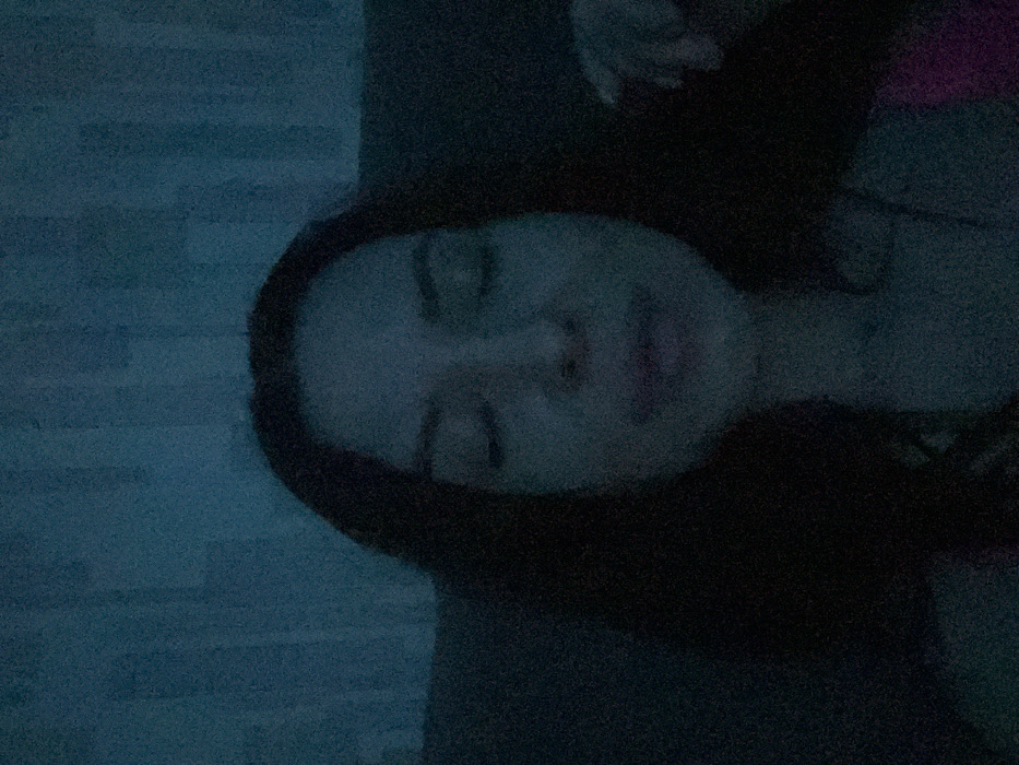 The image depicts a female individual in an indoor setting, an unidentified location within Mytishchi, Russia. She is centrally framed, with dark hair, eyes closed, and mouth slightly open. A pink or reddish garment with thin straps is visible on her upper body. The environment is dimly illuminated with a distinct bluish-green light cast. The background consists of a textured wall behind her head, and a dark, indistinct object, likely an item of furniture, is visible to her right. No other individuals or specific objects are discernible.