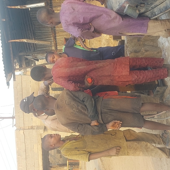In Gudi, Nigeria, six individuals are gathered outdoors around a dark mechanical structure, likely a water pump or wellhead, in a dusty environment. One adult male, wearing a dark baseball cap and a light brown long-sleeved shirt, stands centrally, with his right arm extended towards the mechanism, appearing to demonstrate or explain. Five children or young adolescents surround him, all appearing attentive. A child on the far left wears a distressed, possibly yellow-green, short-sleeved top and light brown pants. Another child, with his back to the camera, wears a dark long-sleeved top with "FCB" written on the back and dark shorts. A third child, also facing away, wears a dark red traditional long-sleeved top and trousers, holding a small, round, orange object in his left hand. A fourth child, positioned between the adult and the structures on the right, wears a dark blue t-shirt with green trim. The fifth child, on the far right with his back partially to the camera, wears a light purple traditional long-sleeved top and light brown pants, leaning against a dark metallic object. The background on the left features an unfinished building constructed from light-colored concrete blocks, while a rudimentary shack with a corrugated metal roof and walls stands on the right. The ground is dry dirt.