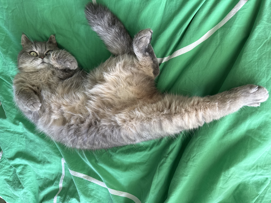 - "A long-haired domestic cat, exhibiting grey and tan fur, is depicted lying supine on a wrinkled, bright green fabric surface" by FM-zk5wI2, licensed under CC BY 4.0