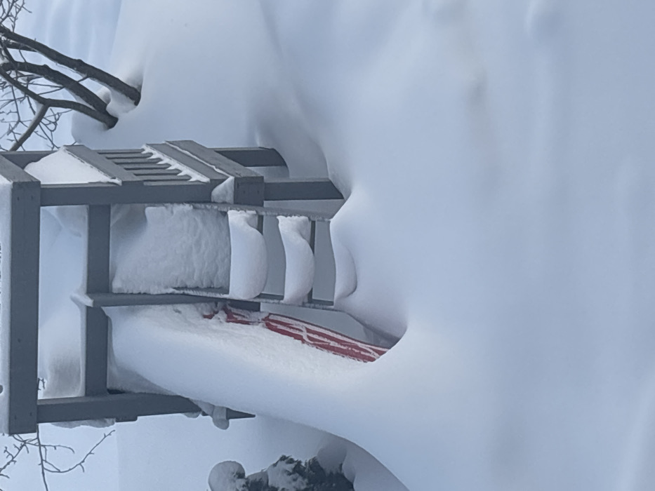A gray, two-tiered wooden shelf stands heavily laden with snow. A red and white striped item, partially buried in the snow, is visible on the lower shelf. Massive snowdrifts obscure much of the background and engulf parts of the shelf itself, suggesting a significant snowfall. Bare tree branches are visible in the upper left, also dusted with snow.