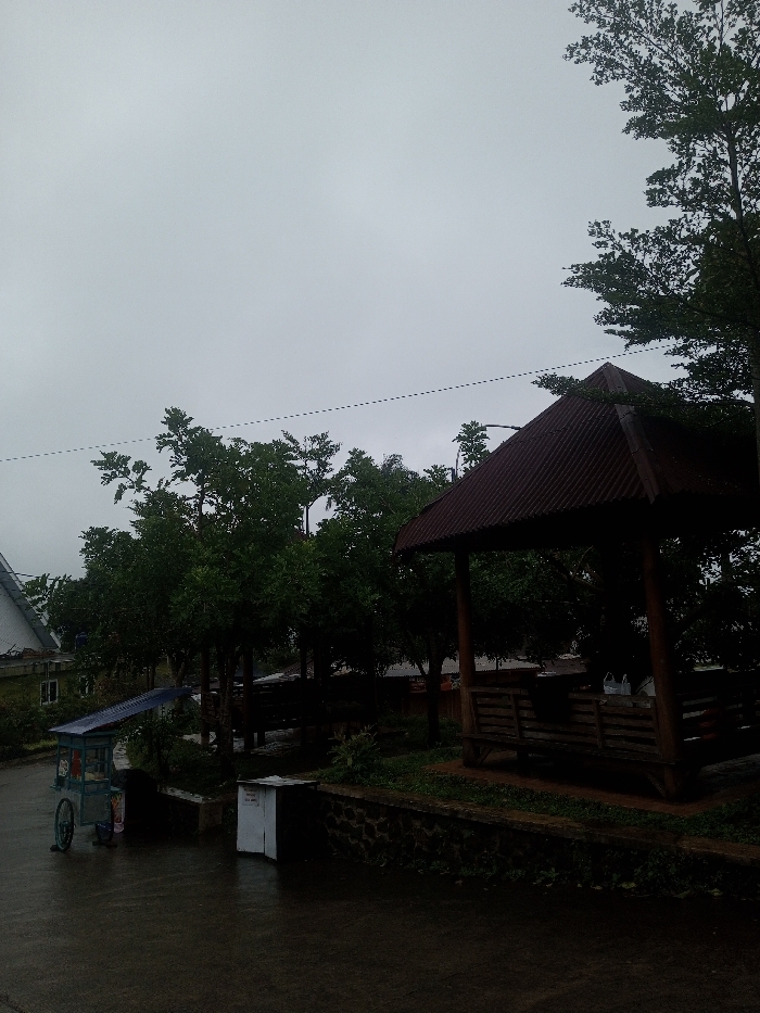 A cloudy day shows a quiet scene. A dark-roofed gazebo stands to the right, its benches visible inside. Lush trees are scattered throughout. To the left, a food cart with a blue awning is parked next to a white box. The road is wet, suggesting recent rain. The landscape is somewhat elevated, with houses visible in the background. An electrical wire cuts across the top of the image.