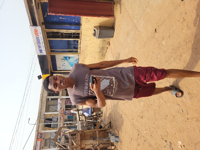The image depicts an outdoor scene in what is identified as the city of Candelaria, Colombia, under clear daylight conditions. A young adult male, with dark skin and short, dark hair, is the primary subject, positioned slightly left of center and walking towards the viewer's right. He wears a dark brown sleeveless t-shirt featuring a light-colored graphic print that includes Chinese characters, and maroon cargo shorts with zippered thigh pockets. He is wearing grey slide sandals. His left hand holds a black smartphone, while his right hand is slightly open at his side. His gaze is directed forward and slightly downwards. The ground is unpaved, consisting of light brown, sandy earth with scattered debris. In the background on the left, a stack of wooden structures or crates is visible, behind which a partially obscured individual in blue attire is seated. Further back, a two-story building with multiple windows and balconies is present. Overhead, utility lines traverse the sky, and a streetlamp is visible. On the right side of the background, a single-story commercial building with light yellow walls features a prominent sign reading "HEALTHY CHOICE DOMI" with smaller text below it. The building has multiple windows with blue-tinted glass, and a white and blue poster is affixed to one window. A grey outdoor waste bin is positioned to the right of the windows, adjacent to a red metallic panel or door. The sky is bright and appears mostly clear.